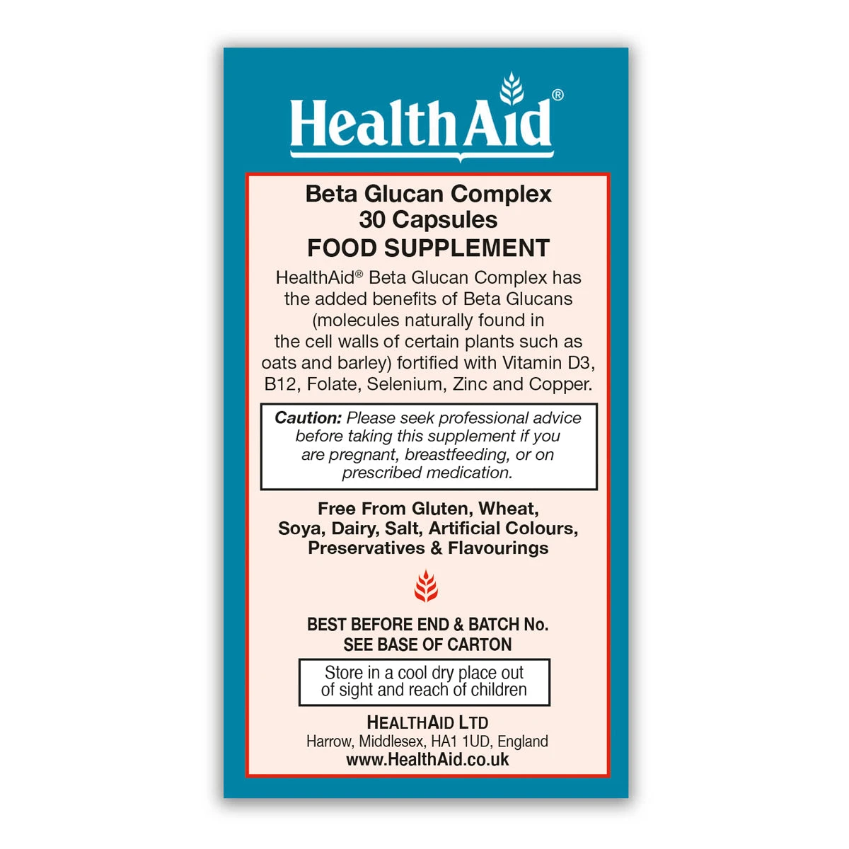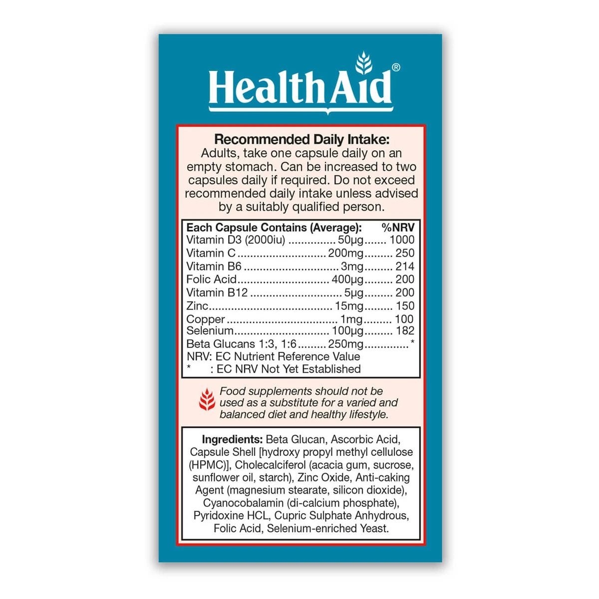 Supporting the body’s natural immunity contributes to an overall feeling of wellness, a reduced duration of feeling unwell and provides relief from some of the signs of cold and flu. HealthAid® Beta Glucan Complex combines the added benefits of Vitamins C, D3 and B12 as well as Selenium, Copper, Zinc and Folate, which are known to contribute to the normal function of a healthy immune system.