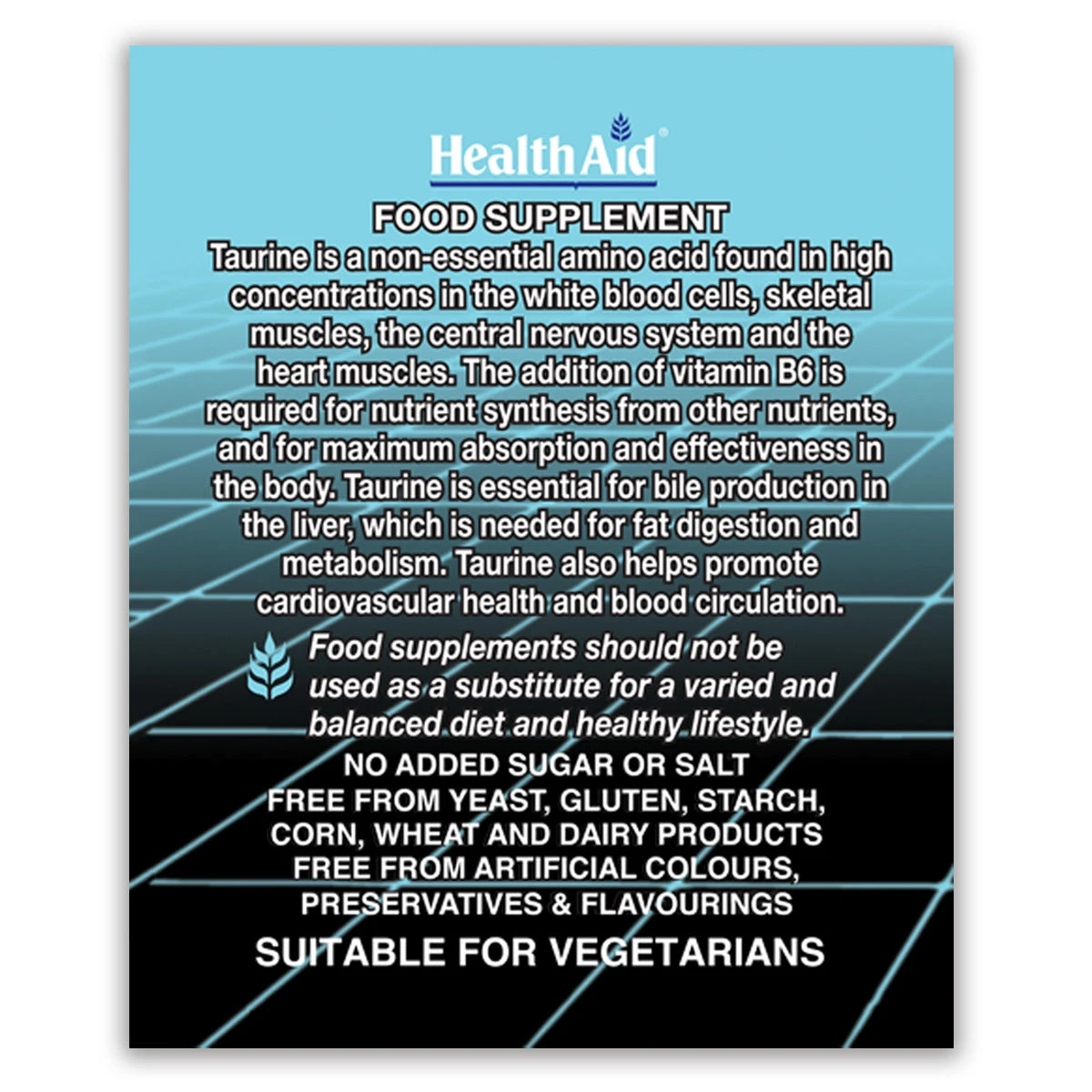 Taurine is non essential amino acid found in high concentration in the white blood cells, skeletal muscles, the central nervous system and the heart muscle. The addition of vitamin B6 is required for nutrient synthesis from other nutrients, and for maximum absorption and effectiveness in the body. Taurine is essential for bile production in the liver, which is needed for fat digestion and metabolism. Taurine also contributes to the maintanance of normal cholesterol levels, blood pressure and a healthy cardiovascular system.