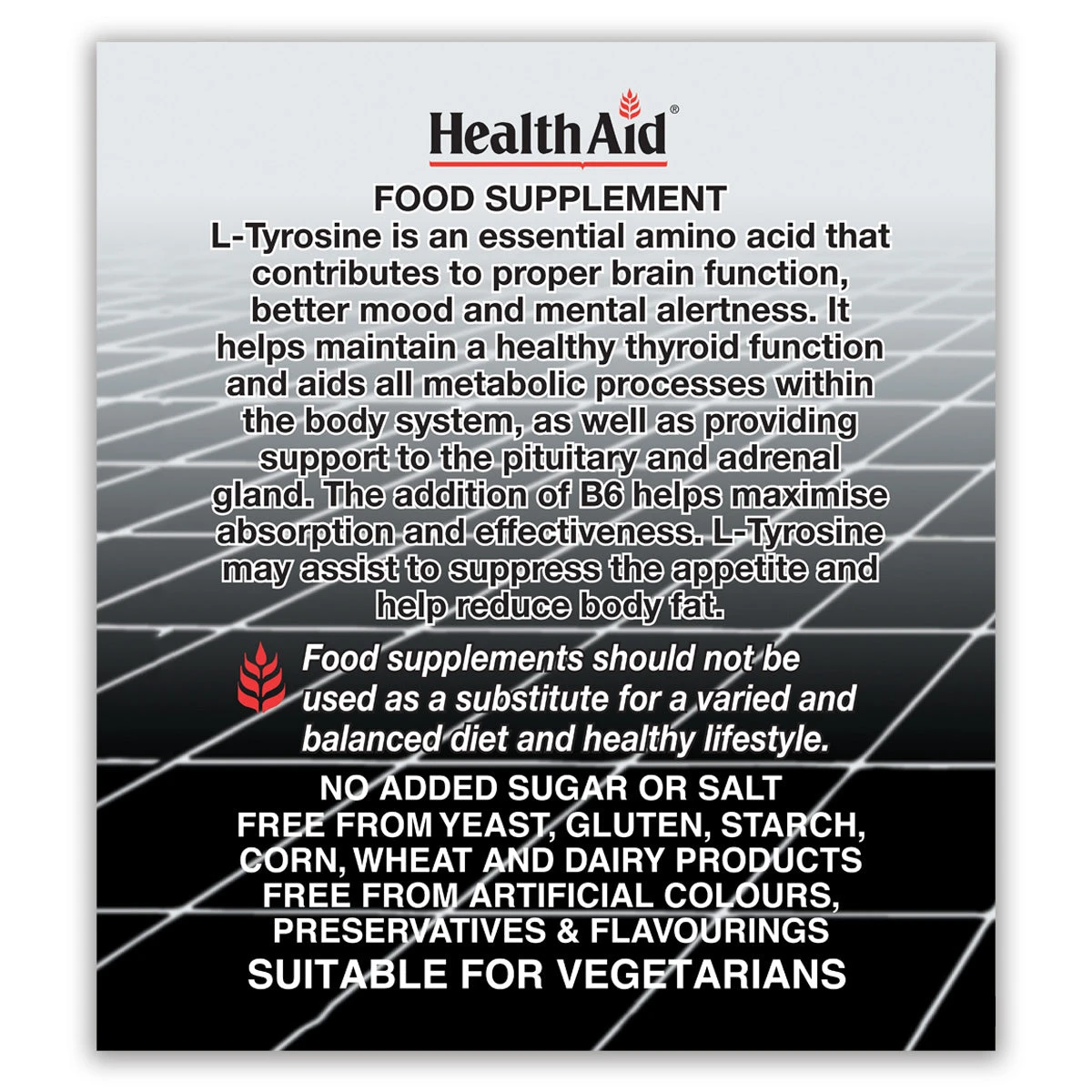 L-Tyrosine Tablets contains L-Tyrosine, which is an amino acid essential for the maintenance of proper brain function and mental alertness. L-Tyrosine maintains a healthy thyroid function and aids all metabolic processes within the body system, as well as giving a rush to the pituitary and adrenal gland.