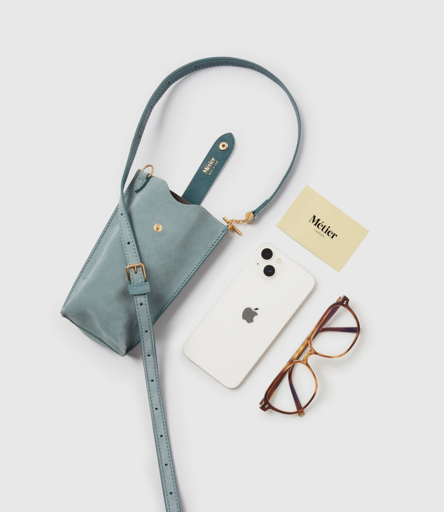 An elegant crossbody for your most important essentials featuring two separate compartments, one padded for your glasses or sunglasses and the other fitted for your phone, keys and most important card. Its adjustable and removable leather strap attaches from our signature solid brass hardware for added versatility. Lightweight and compact, the Minimalist Double is the perfect accessory for exploring a new city or when you need only your essentials at hand. Fits up to an iPhone 15.