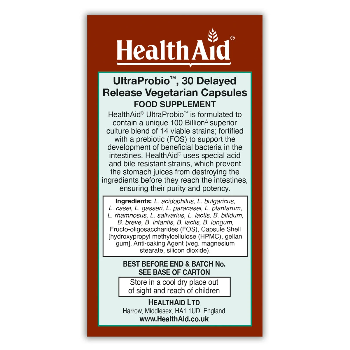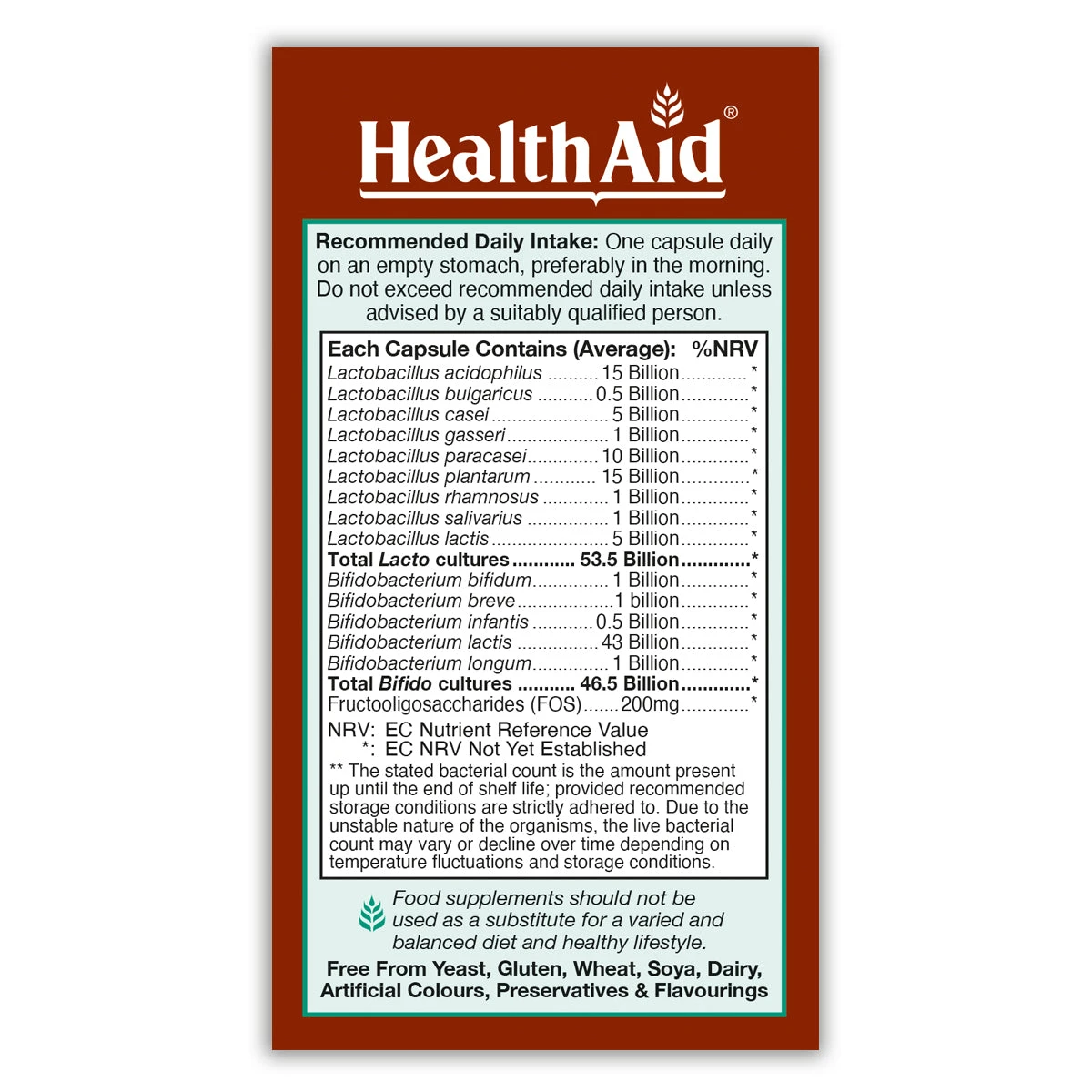 HealthAid® UltraProbio™ helps to supplement your diet by replenishing the ‘friendly’ bacteria, support the immune system and assist in the absorption of nutrients within the gut by providing a superior blend of 100 billion special strains of Lactobacillus and Bifidobacterium (live cultures), using 14 different acid and bile-resistant strains. This ensures that the bacteria are not destroyed by the stomach juices before they reach the intestines. Fructo-Oligosaccharides (FOS), a prebiotic, has been added to help support the growth and survival of ‘friendly’ bacteria in the intestinal tract.