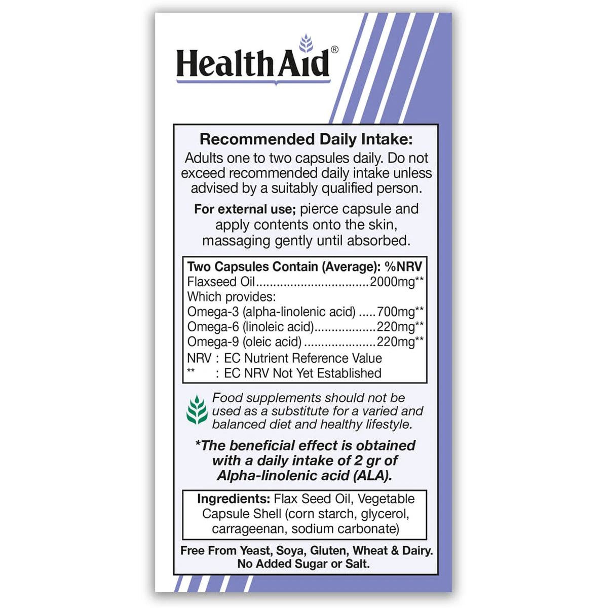 HealthAid® Omega 3, 6, 9, sourced from Flaxseed Oil, contains high–quality essential fatty acids. The body cannot produce Omega-3 and 6, Omega 9 is produced by the body, however due to poor diet we cannot always produce enough. Therefore, Omega-3, 6 and 9 need to be provided by a healthy diet and supplementation. Omega-3 provides Alpha-Linoleic Acid (ALA), which contributes to normal blood cholesterol levels. Omega 6 is a rich source of GLA (Gamma–Linolenic Acid), which may benefit general body metabolism. Omega 9 is a rich source of Oleic Acid, which is helpful in supporting cardiovascular health. Vegan Omega 3, 6, 9 is particularly beneficial for brain function and vision.