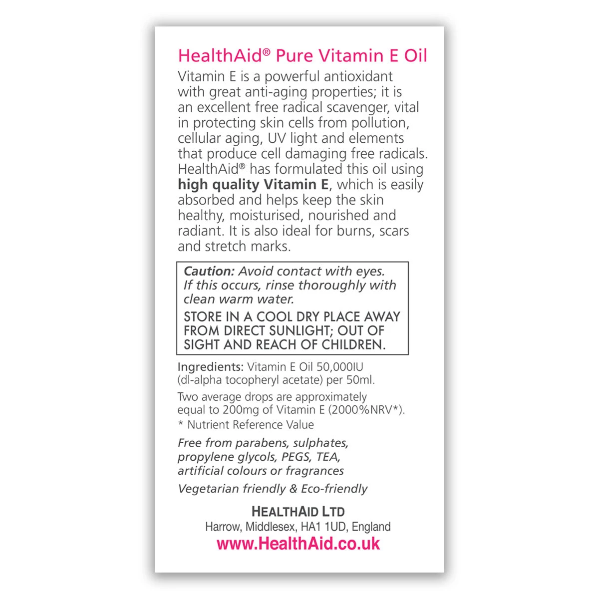 Vitamin E is a powerful antioxidant with great anti-aging properties; it is an excellent free radical scavenger, vital in protecting skin cells from pollution, cellular aging, UV light and elements that produce cell-damaging free radicals. HealthAid® has formulated this oil using high-quality Vitamin E, which is readily absorbed and helps keep the skin healthy, moisturized, nourished and radiant. It is also ideal for burns, scars and stretch marks.
